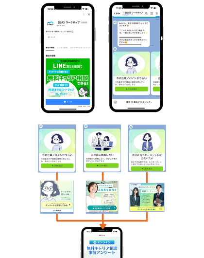 友だち追加後の行動を逆算し、集客からCV、リピートまでを見据えたLINE運用の全体戦略を設計します。